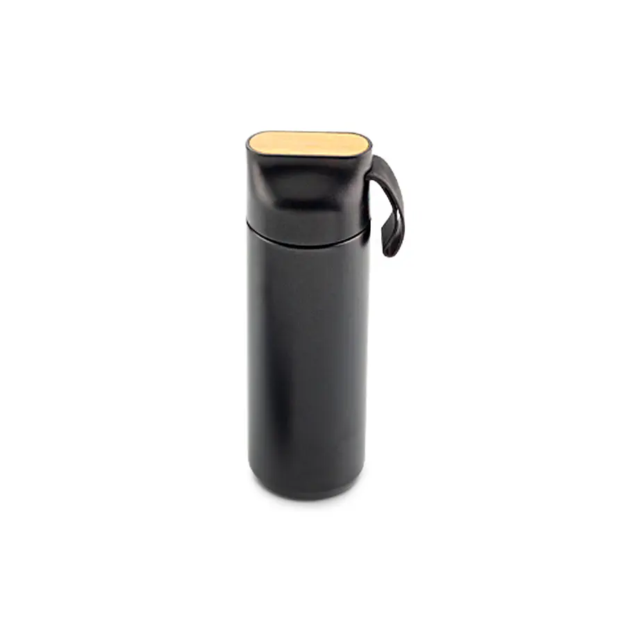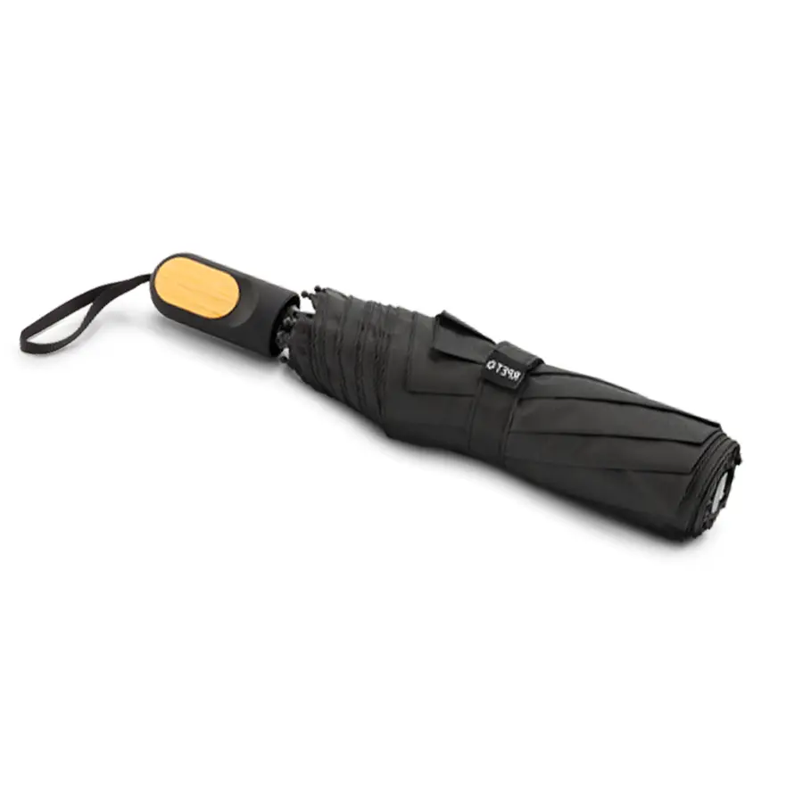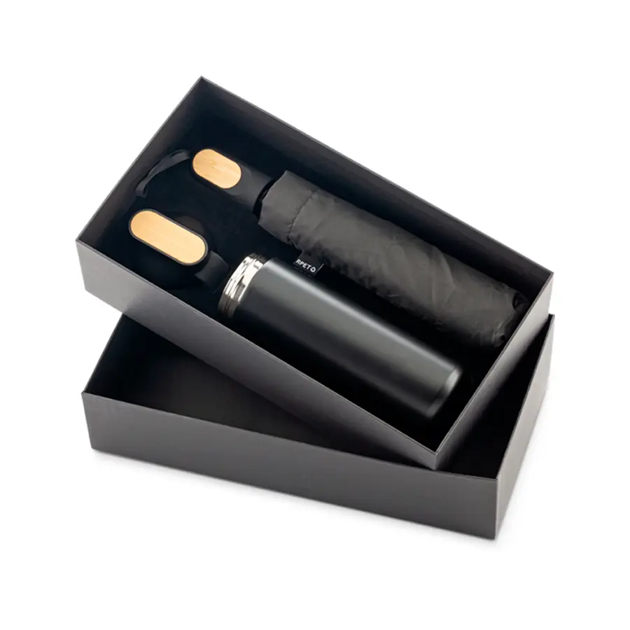 Set ecológico de botilito doble pared vacuum en acero inoxidable reciclado, con aislamiento térmico que mantiene la bebida fría o caliente hasta 6h, aprox (puede variar dependiendo condiciones climáticas). Con tapa rosca y detalle en bambú y Mini paraguas de 21″ en poliéster reciclado RPET, con apertura automática, mango en caucho, herraje metálico. Con forro. Empaque caja individual.