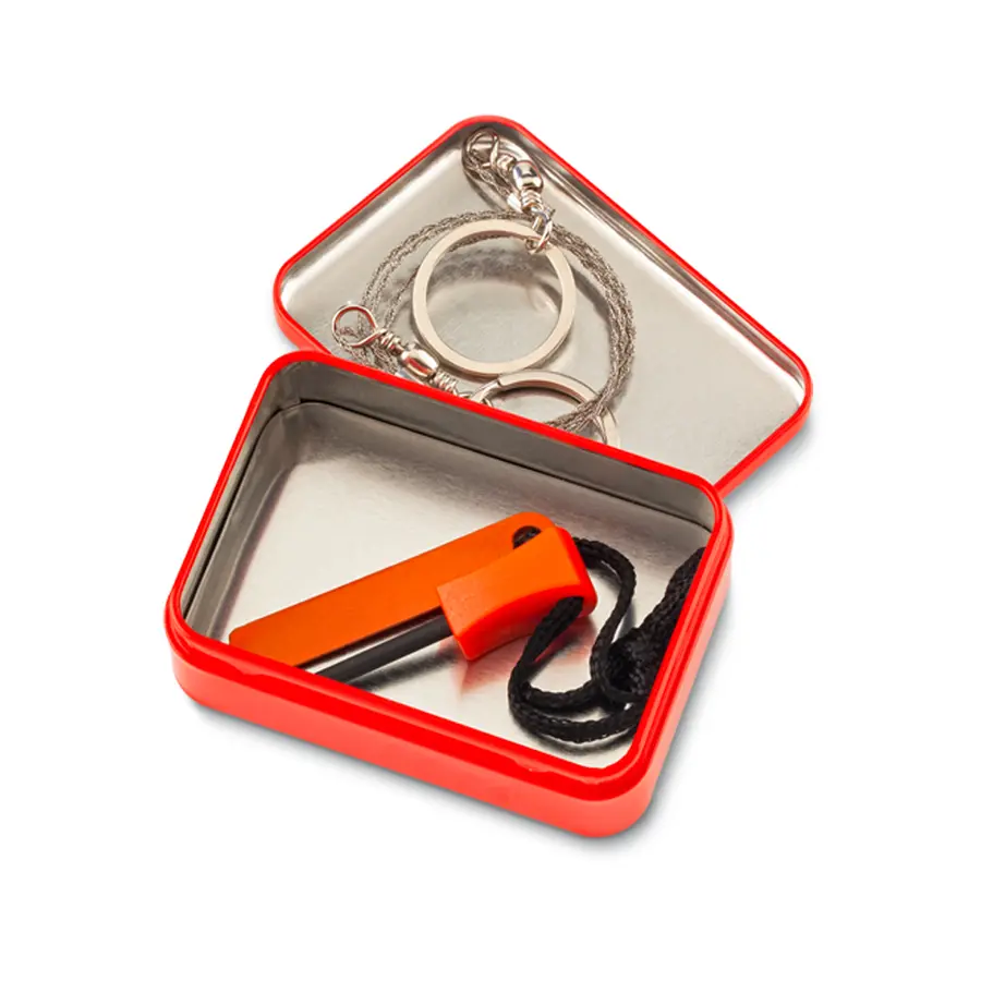 Incluye caja metálica y 6 diferentes accesorios: silbato, alicates multifunción con luz LED, mini brújula, tarjeta de supervivencia de acero con funda, iniciador de fuego y cordón de sierra.