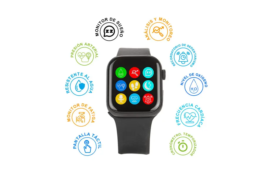 Reloj inteligente con pantalla táctil de 1,73″ TFT color. Análisis y monitoreo del número de pasos, calorías, distancia, monitor de fatiga, monitor de sueño, nivel de oxígeno, frecuencia cardíaca y presión arterial, y recordatorio de sedentarismo. Resistente al agua (nivel IP67). Incluye cronómetro, temporizador y reloj.