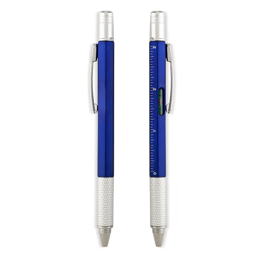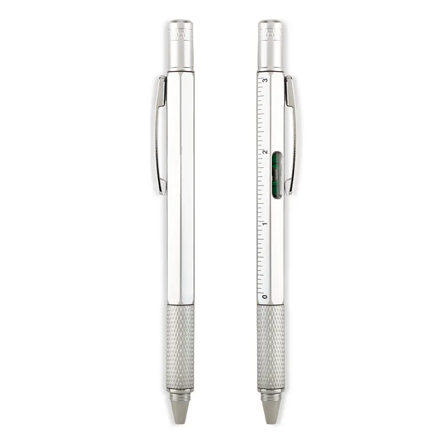 Bolígrafo plástico con mecanismo twist. Clip metálico, regla, nivelador y 2 destornilladores.