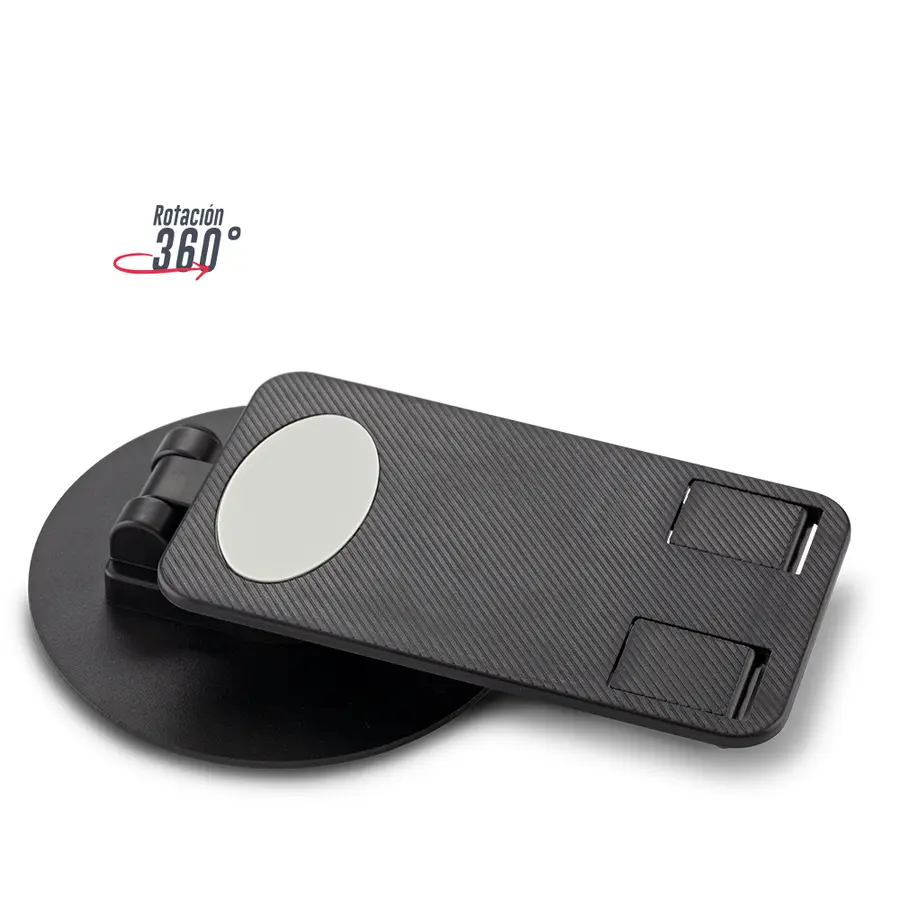 Soporte plástico, plegable y escualizable con rotación de 360°. Accesorios antideslizantes en silicona. Empaque caja individual.