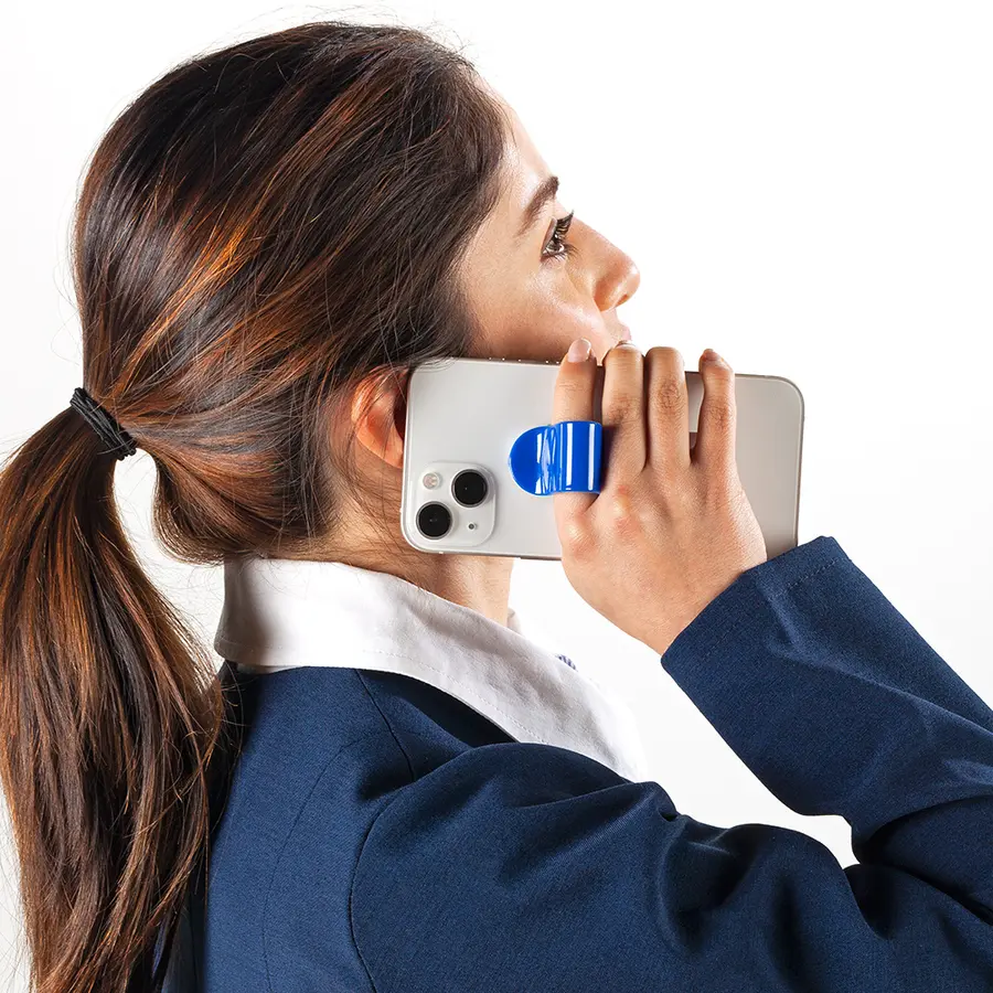 Soporte plástico flexible para móviles con adhesivo.