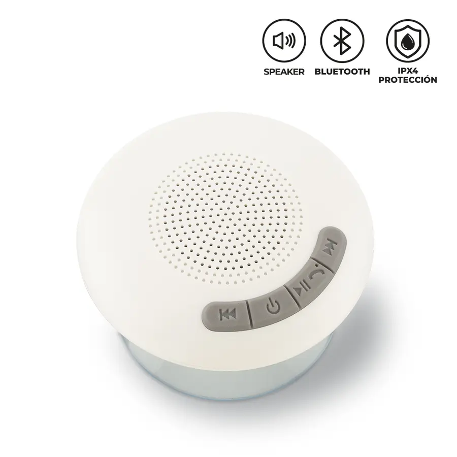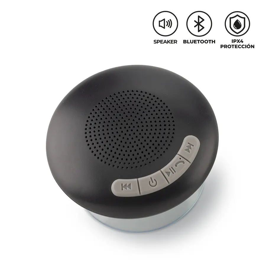 Speaker Bluetooth plástico con chupa. Resistente al agua. Potencia: 3W. Capacidad de la batería: 300 mAh. Tiempo de funcionamiento: 2 horas aprox. Rango de conexión: 10 mt.