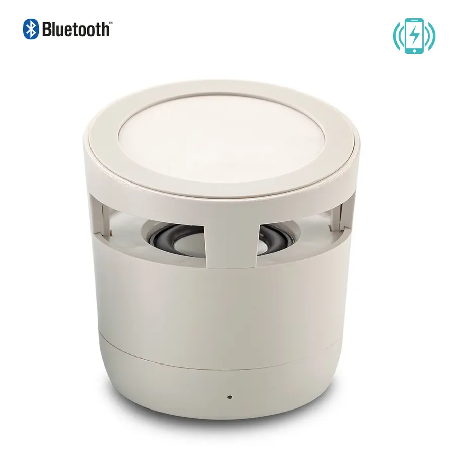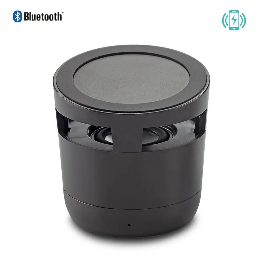 Speaker Bluetooth plástico de 3W. Con cargador inalámbrico para móviles de 5W. Batería de 300mAh. Compatible con dispositivos equipados con tecnología de carga inalámbrica. Empaque caja individual.