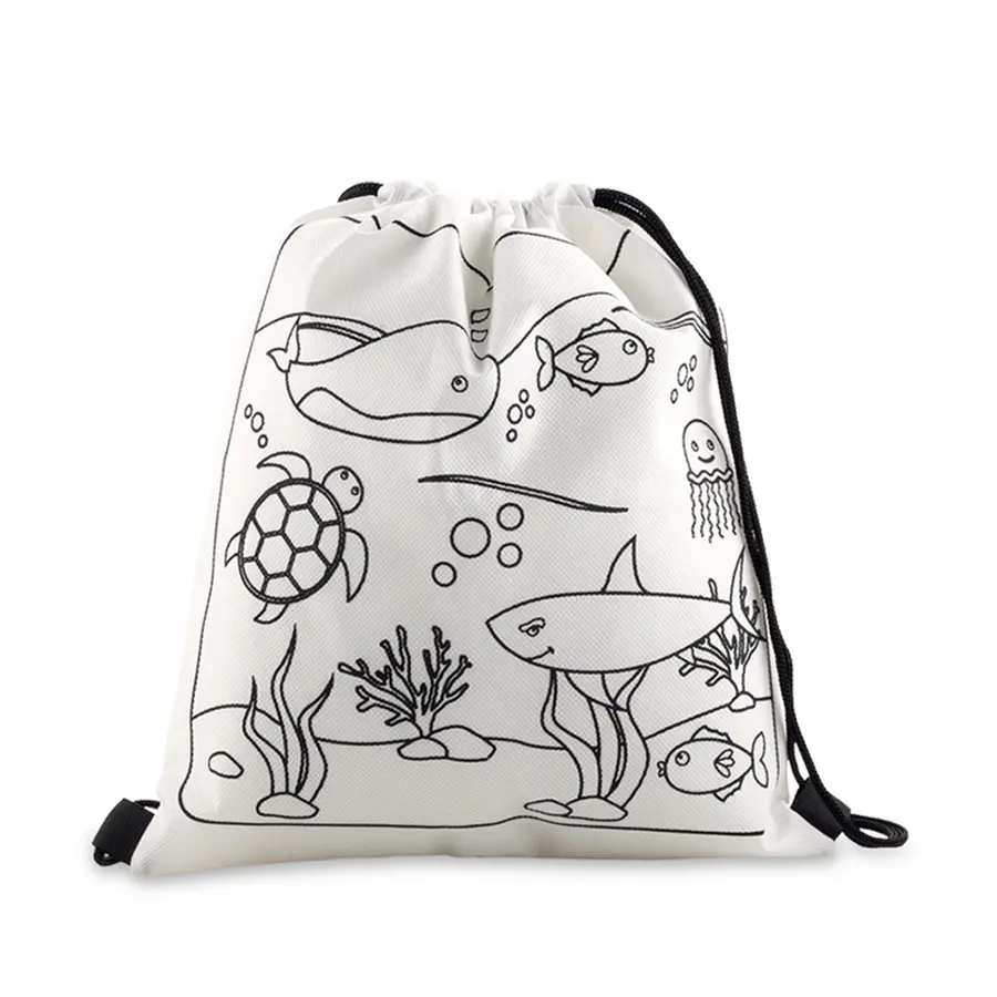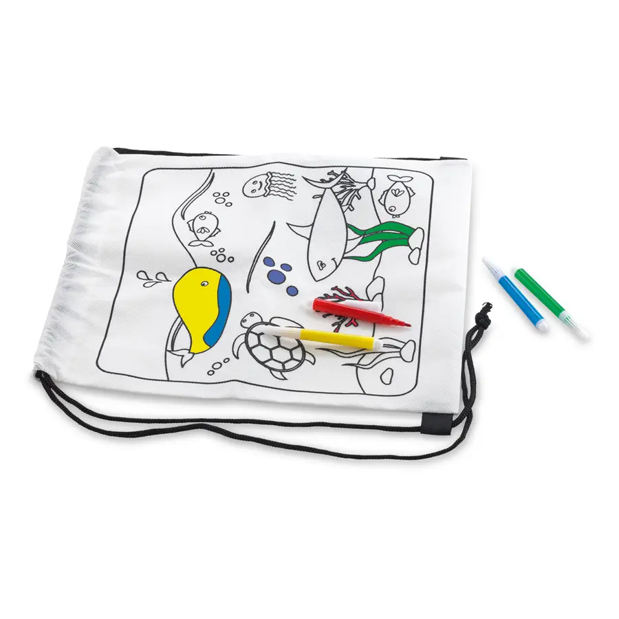 Bolsa en cambrel cosida para niños con dibujo para colorear. Incluye 4 marcadores de tinta lavable.