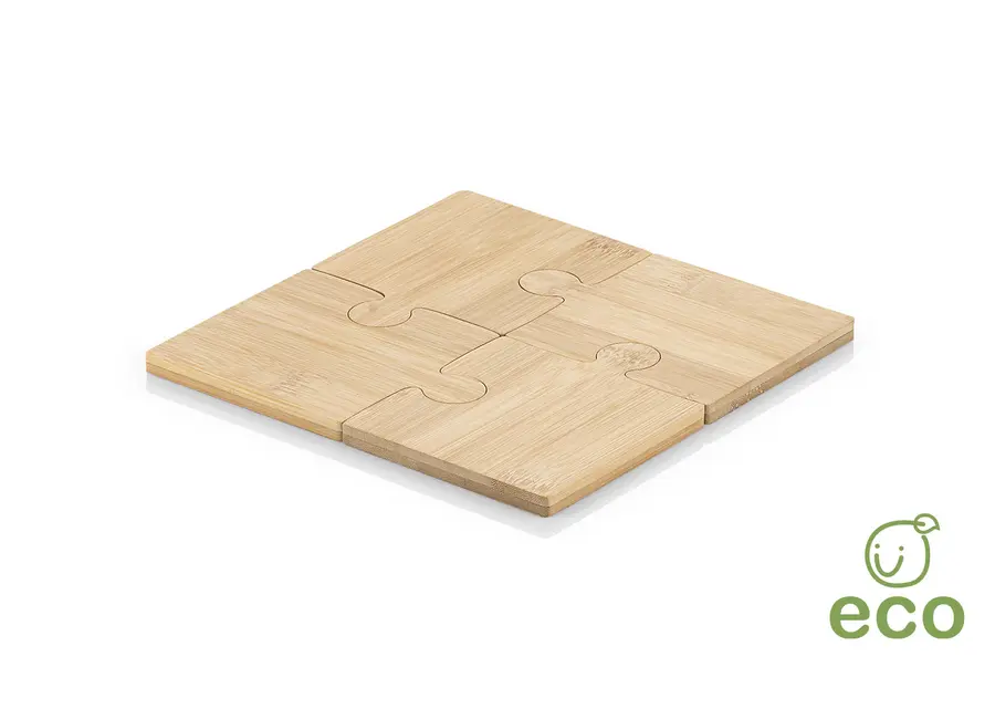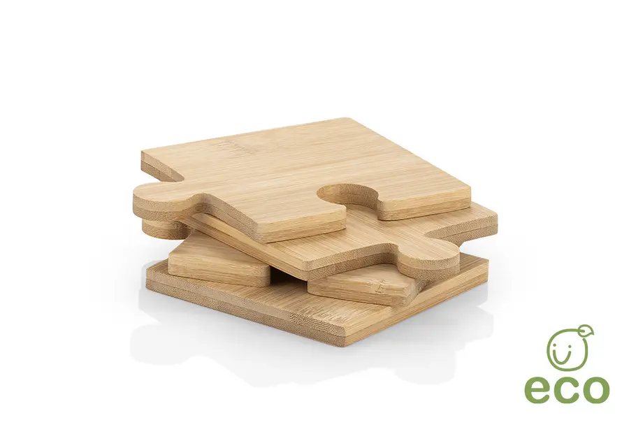 Prácticos portavasos en Bambú y forma de puzle, que al unir se puede usar como tabla de Picar.