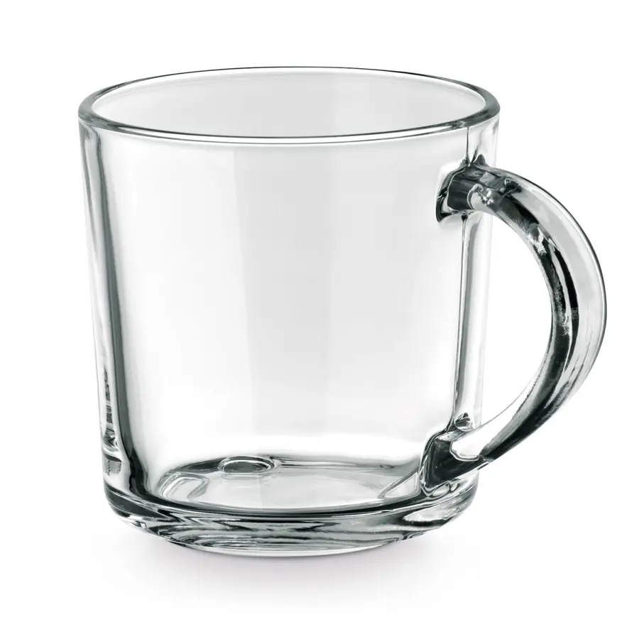 Taza de vidrio transparente y resistente.Apta para bebidas frias o calientes Apta para lavavajillas y microondas.Capacidad:.Caja master: 36 unidades.