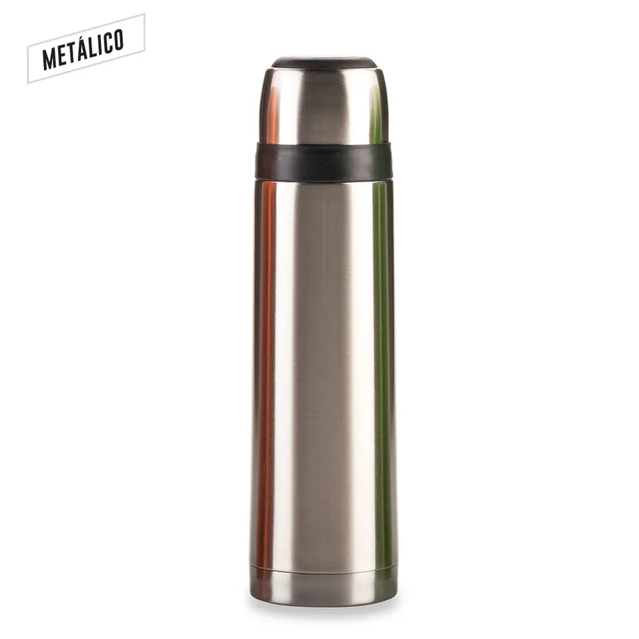 Termo doble pared en acero inoxidable, tapa rosca y cierre a presión. Con estuche imitación cuero negro. Empaque caja Individual.