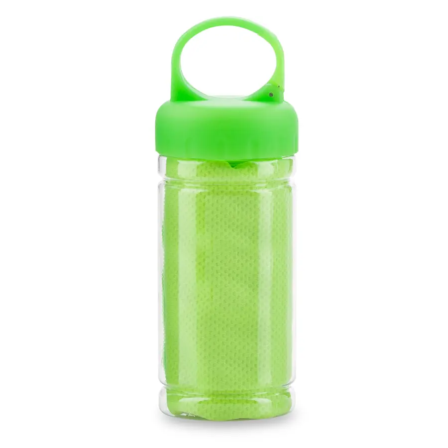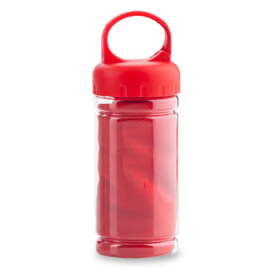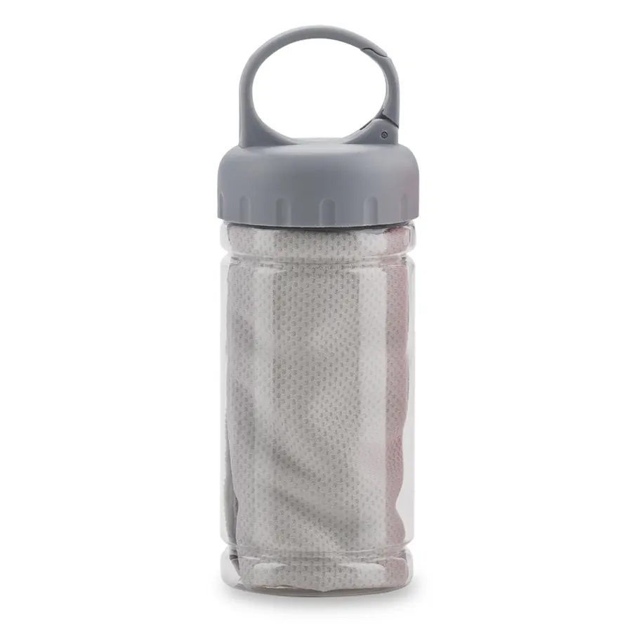 Toalla poliéster con tejido especial que al humedecerse bloquea el agua, manteniendo la temperatura de 3 a 4 horas. Su estructura permite que el agua reduzca la sensación de calor. Empaque tarro PVC.