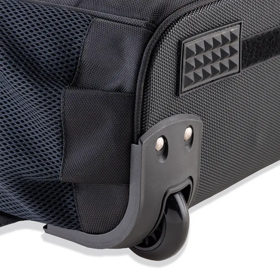 Trolley backpack en poliéster 1680D con dos compartimentos, bolsillo para portátil y dos mallas laterales.