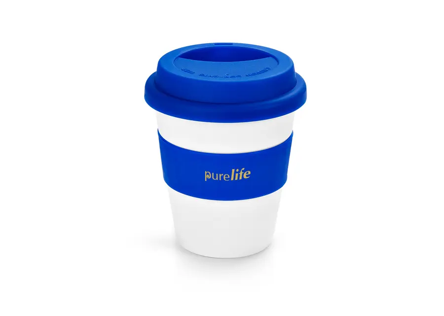 Vaso plástico con tapa y protector en silicona. Encaja en la mayoría de porta vasos de los autos. En PP Libre de BPA, ftalatos u otras sustancias nocivas. No retiene ni transmite sabores u olores. Capacidad 356 ml / 12 Oz.