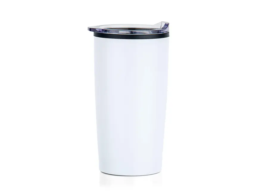 Vaso de doble pared con recubrimiento interior en PP y tapa plástica con cierre corredizo. Capacidad: 600ml, peso: 220g. Temperatura recomendada de ?60 °C.
