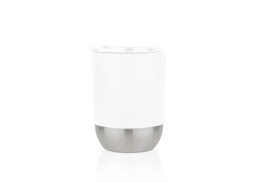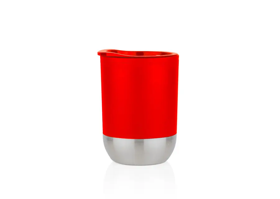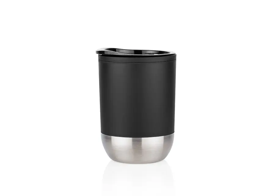 Vaso plástico para café. Resistente, con recubrimiento inferior de metal. Tapa con boquilla para deslizar con caucho en la rosca para evitar derrames. Capacidad 300ml/10 Oz