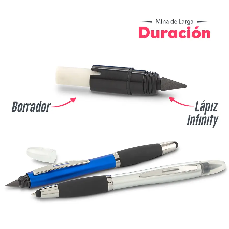 Bolígrafo plástico con stylus, borrador y lapíz infinity. Este producto funciona de una manera innovadora, con una mina que no se acaba fácilmente, no necesita usar tajalápiz. La punta frota el papel para descomponer las moléculas de grafito y dejarlas en la superficie de papel; el lápiz borrable se puede aplicar en la mayoría de los papeles, y la escritura a mano se puede mantener durante mucho tiempo independientemente de la temperatura o las condiciones climáticas. Entre más suave sea el trazo, más fácil será de borrar.